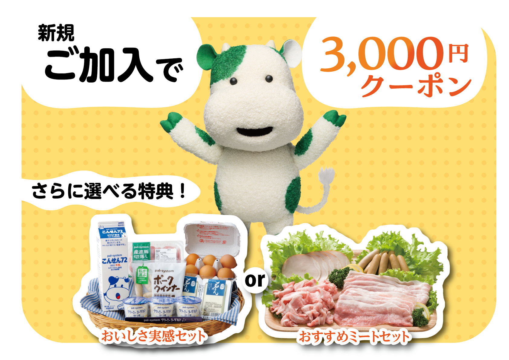 新規加入のお客様へ、 ①3000円分のクーポン券 ②おいしさ実感セット または おすすめミートセッ…