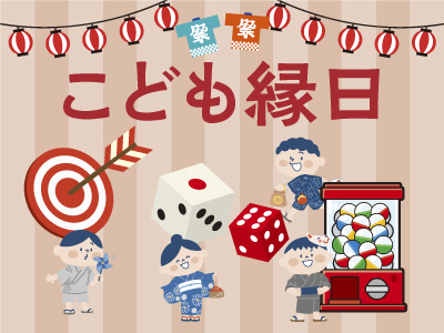 こどもたちが楽しめる縁日コーナー! ダーツやサイコロ、ガチャ等お子さまが夢中になる楽しいゲームが満載です。