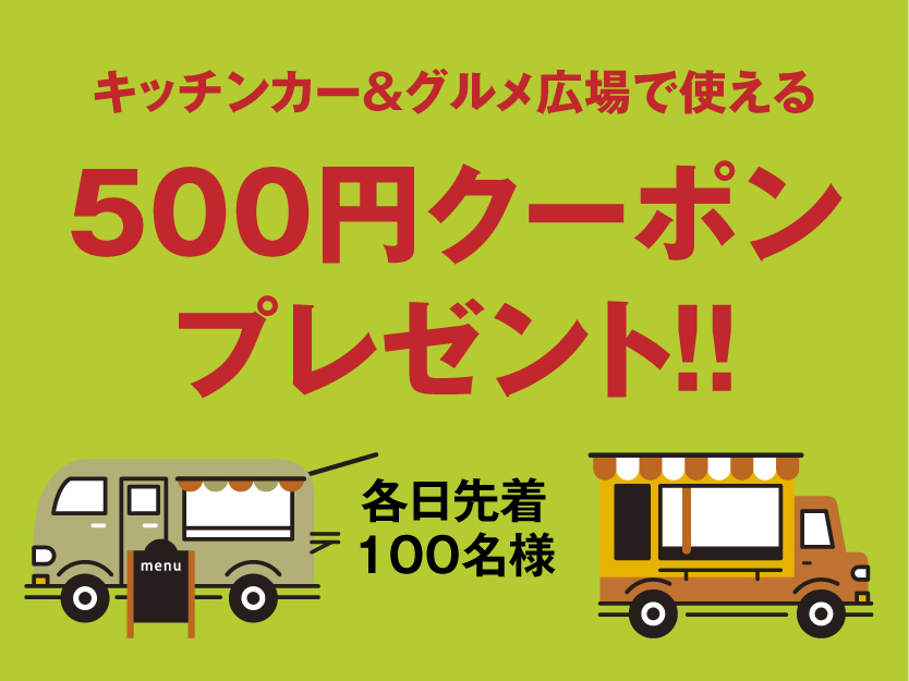 ご来場の上、インスタグラムのフォロー画面をご提示いただいた方、先着100名様にキッチンカー&グルメ広場で使える500円クーポンプレゼント!