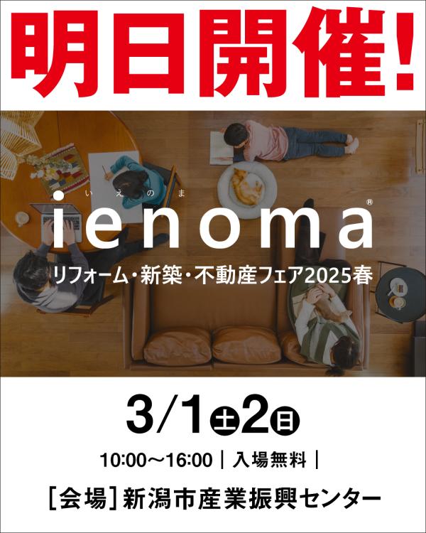 【明日から、新潟開催!】 ienoma(いえのま)リフォーム・新築・不動産フェア2025春 いよいよ明日から、新潟会場で開催! 3月1日(土)・2日(日) 新潟市産業振興センター 家づくりを考える2日間です✨ ▶ リフォームも新築も不動産も!住まいのお悩み、すべて解決! ▶ 最新アイテムが揃ったショールームで実際に体感! ▶ 住宅ローンや相続、税務、保険などの相談もその場でアドバイス! 家族みんなで楽しめるイベントも充実✨