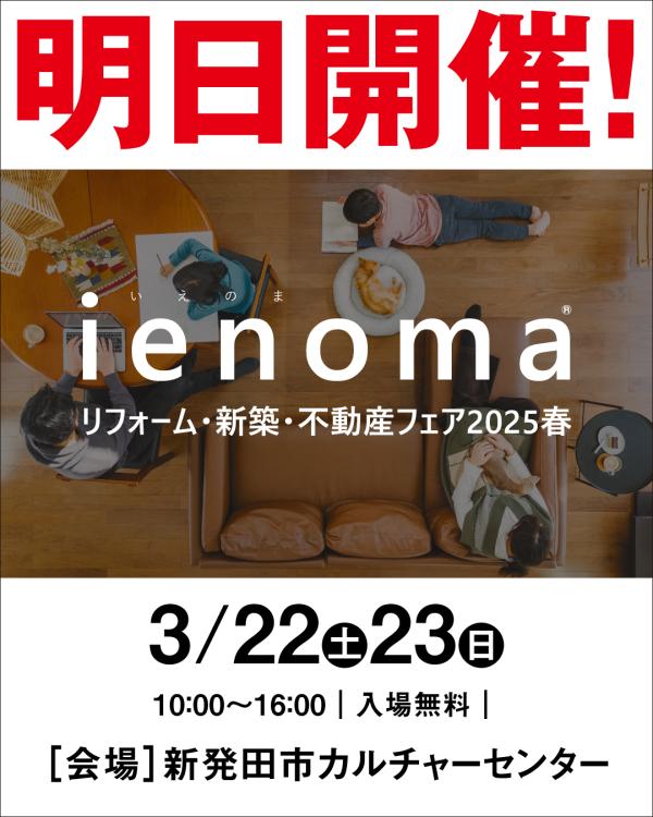 【明日から、新潟開催!】 ienoma(いえのま)リフォーム・新築・不動産フェア2025春 いよいよ明日から、新発田会場で開催! 3月22日(土)・23日(日) 新発田市カルチャーセンター 家づくりを考える2日間です✨ ▶ リフォームも新築も不動産も!住まいのお悩み、すべて解決! ▶ 最新アイテムが揃ったショールームで実際に体感! ▶ 住宅ローンや相続、税務、保険などの相談もその場でアドバイス! 家族みんなで楽しめるイベントも充実✨