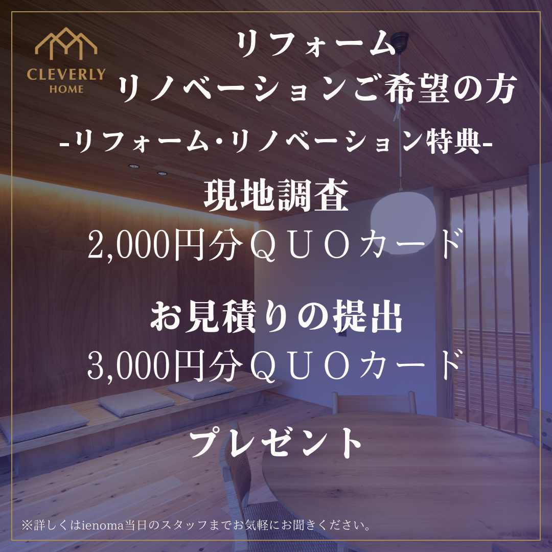 ※ご家族様1組につき、1回限りの特典となります。すでにいずれかのクレバリーホームの店舗にて「WEB相談」または「ご来場」いただいている方は特典の対象外となります。