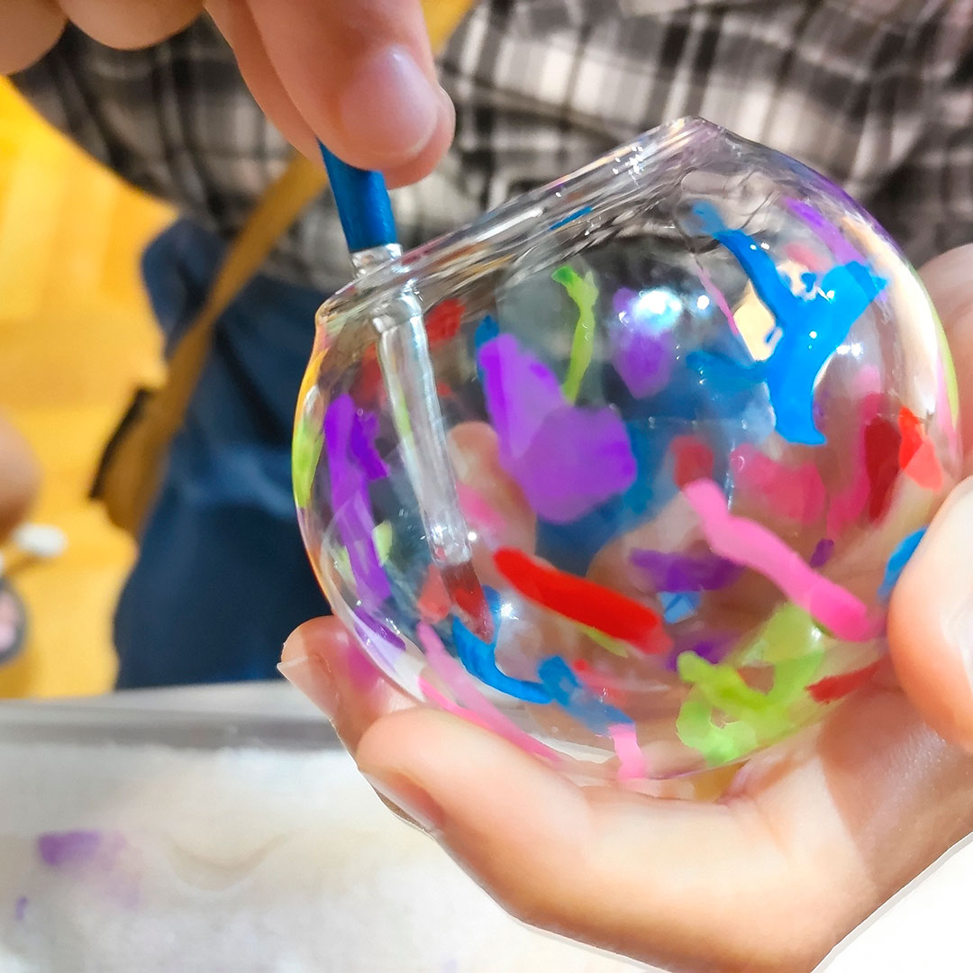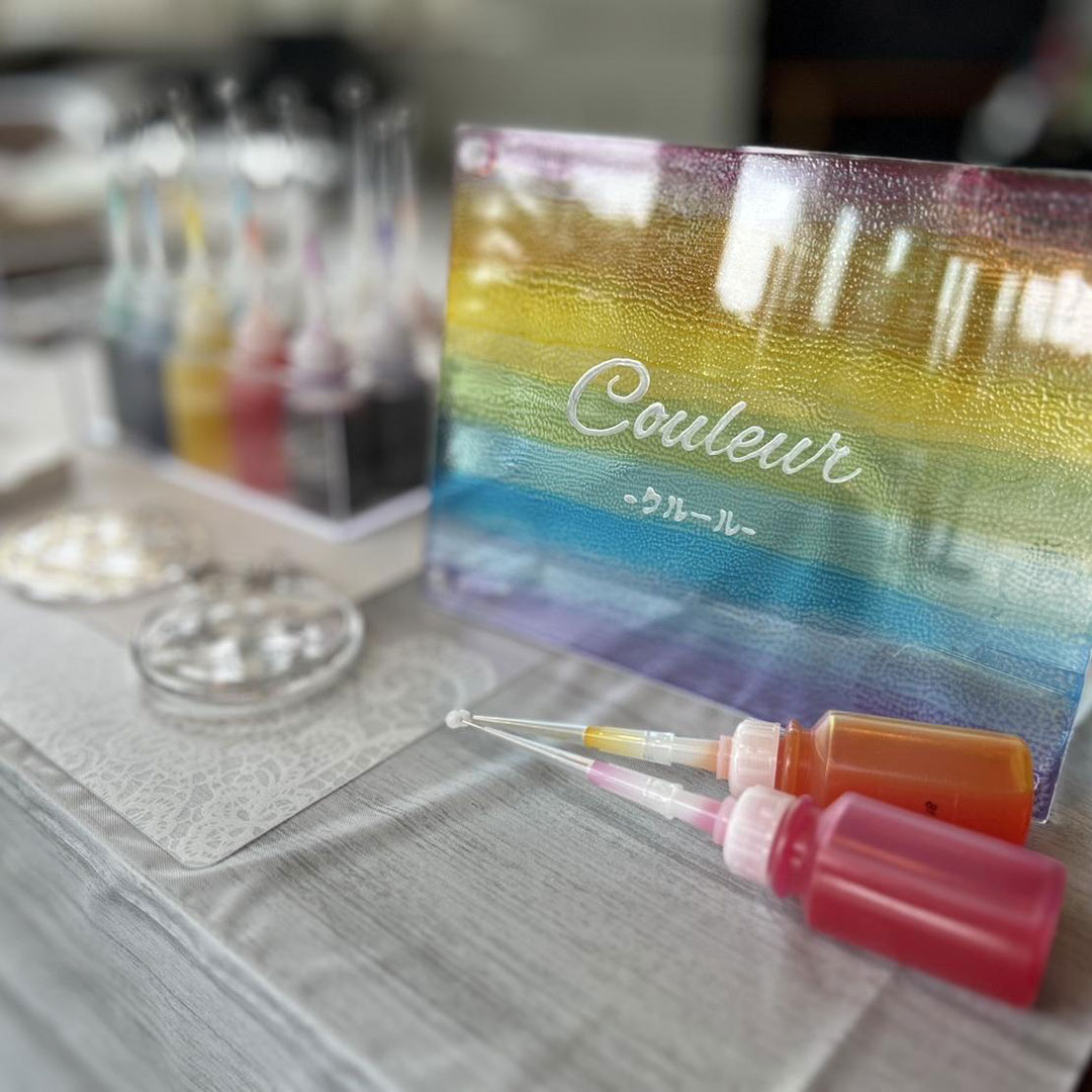 透明な液体絵の具を使用し、ステンドグラスのようなキラキラなアート体験&ディンプルアート雑貨の販売です♡