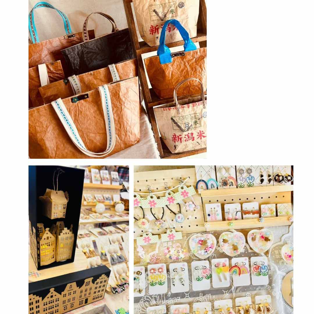 親子でハンドメイドを楽しんでいます(母)丈夫な米袋でトートバッグや雑貨(娘)可愛らしさを大切にしたアクセサリー。