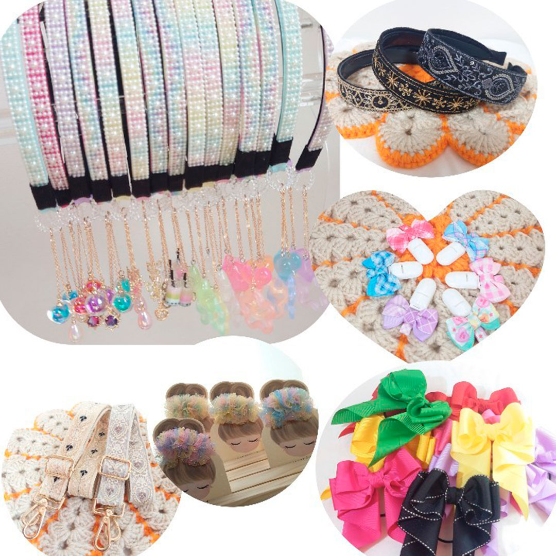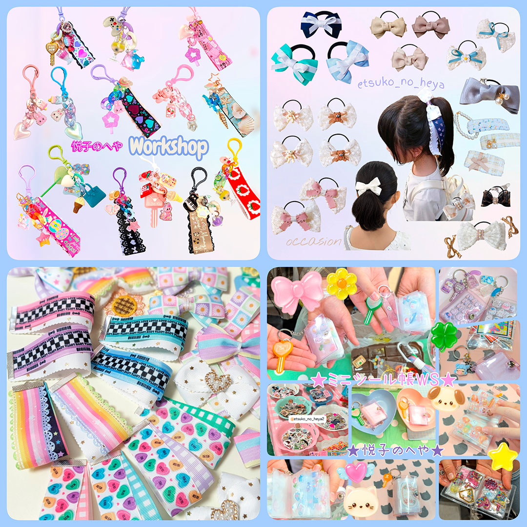 お子様から大人まで使えるかわいいリボンを使ったヘアアクセサリーやショルダーストラップなどを販売します。