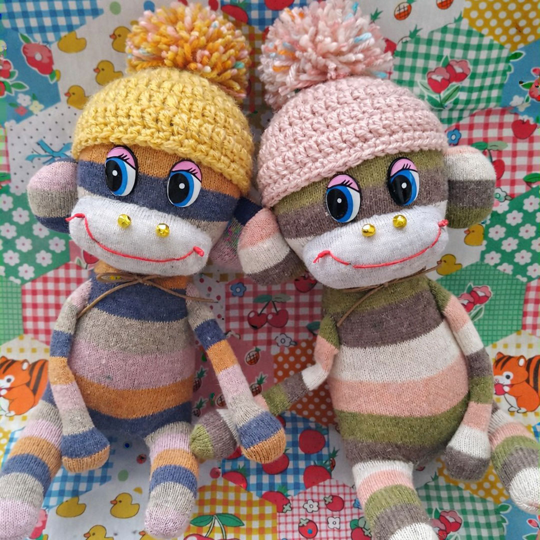消しゴムはんこ、プラ板アクセサリー、靴下で作ったオリジナルぬいぐるみ…どれも我が子との日常から生まれた作品たち。
