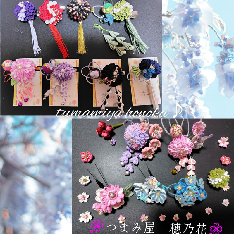 伝統工芸のつまみ細工の手法を用いて、四角い布を1枚1枚心を込めて手作りしています。