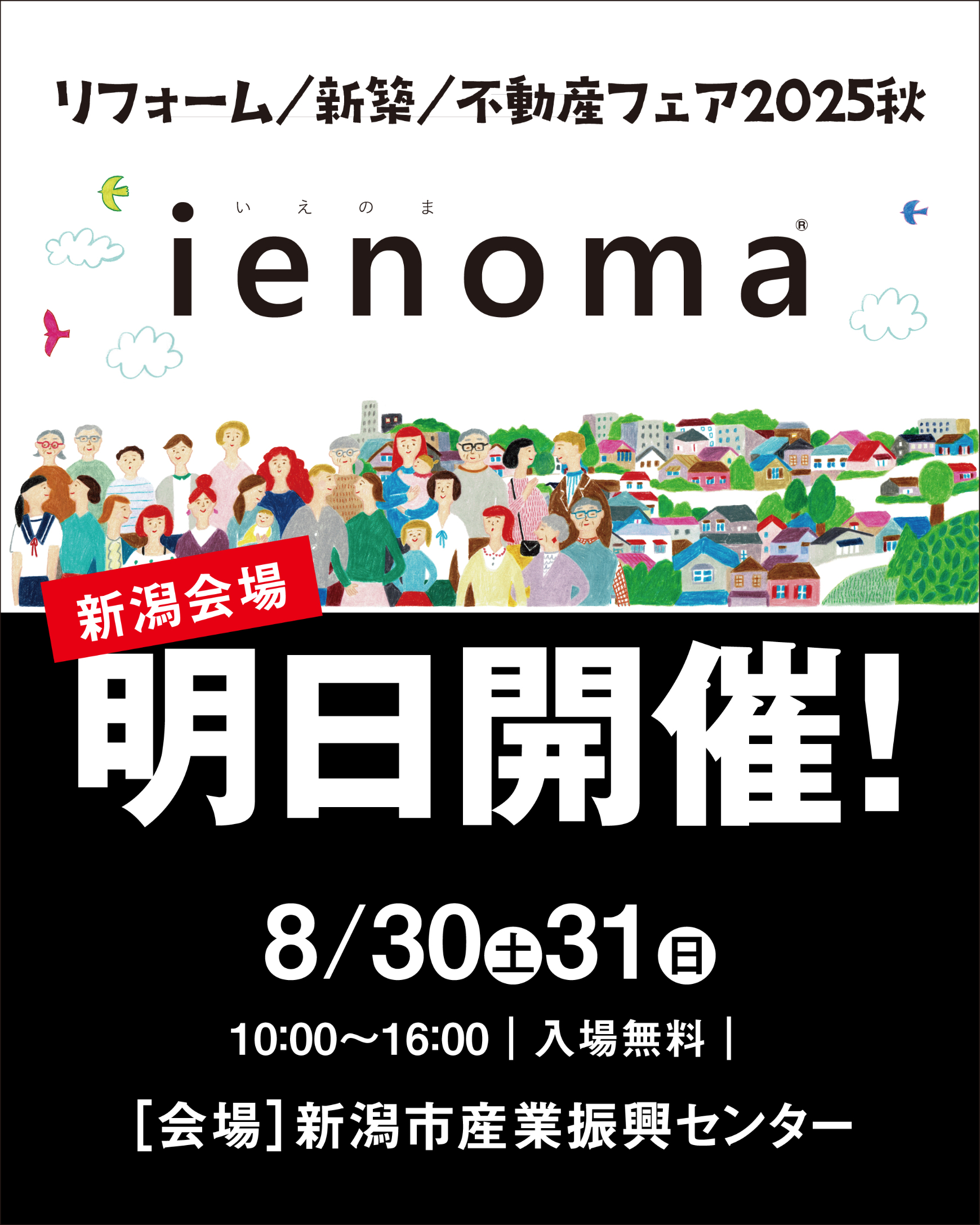 【明日から、新潟開催!】 ienoma(いえのま)リフォーム・新築・不動産フェア2025秋 いよいよ明日から、新潟会場で開催! 8月30日(土)・31日(日) 新潟市産業振興センター 家づくりを考える2日間です✨ ▶ リフォームも新築も不動産も!住まいのお悩み、すべて解決! ▶ 最新アイテムが揃ったショールームで実際に体感! ▶ 住宅ローンや相続、税務、保険などの相談もその場でアドバイス! 家族みんなで楽しめるイベントも充実✨